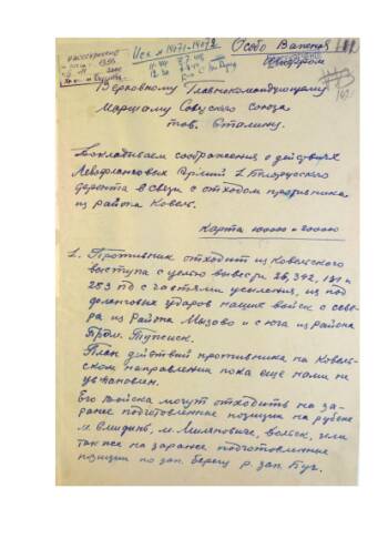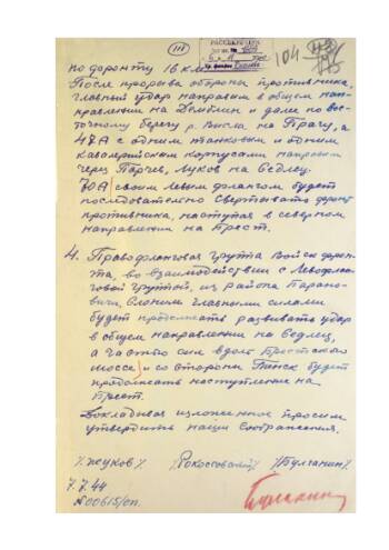 «Директива от 07.07.1944 за № 203845 Штаба 1 Белорусского Фронта». Доклад о действиях левофланговых армий 1 Белорусского Фронта в связи с отходом противника из района Ковель.