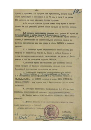 Директива Ставки Верховного Главнокомандования от 28 ноября 1944 г. № 220275 командующему войсками 1-го Белорусского фронта на подготовку и проведение наступательной операции с целью разгрома варшавско-радомской группировки противника. Подлинник.