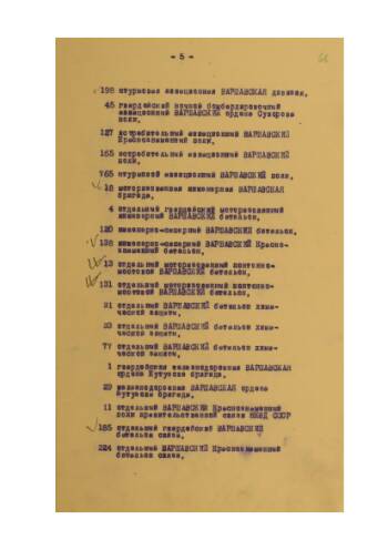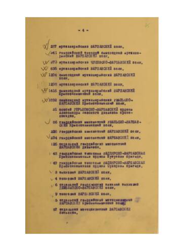 Приказ Верховного Главнокомандующего от 19 февраля 1945 г. № 010 о присвоении наименования «Варшавских» соединениям и частям 1-го Белорусского фронта, отличившимся в боях за овладение городом Варшава
