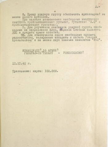 Доклад командующему Западным фронтом командующего 16 армией генерал-лейтенанта Рокоссовского от 12 декабря 1941 г. с соображениями по разгрому Волоколамской группировки противника.