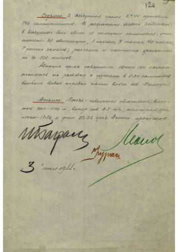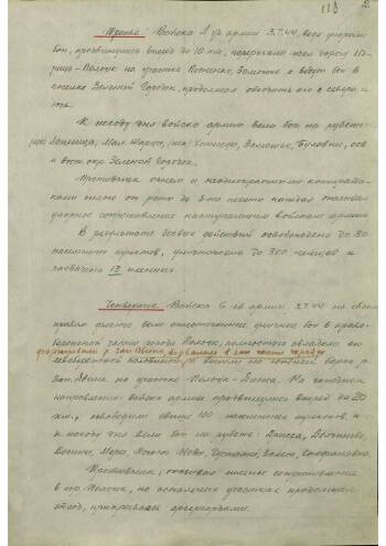 The combat report of the headquarters of the 1st Baltic Front No. 185 dated 3.7.44. The report describes the military operations in the area of the city of Polotsk. The forces of the front are occupied by several large strongholds. The stubborn resistance of the enemy in Polotsk is described, despite this, the actions of the front with the support of aviation are successful. The railway line Idritsa-Polotsk was cut. The enemy’s losses are indicated, including in aviation, trophies and prisoners are listed. Further strikes by the armies of the front are outlined.