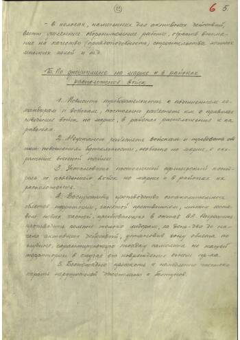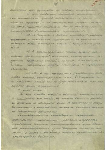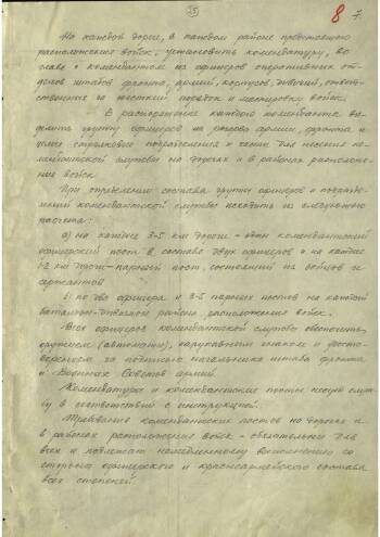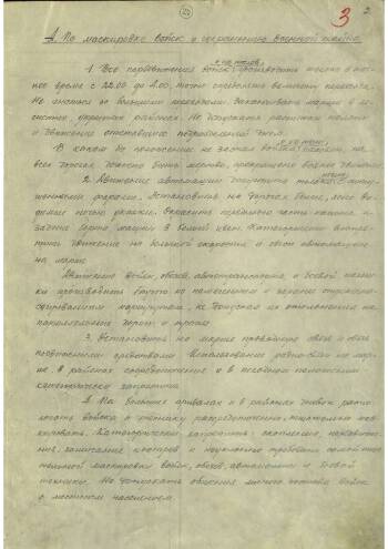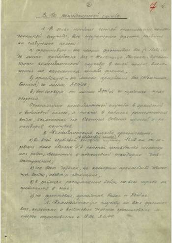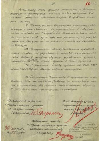 Directive of the Military Council of the 1st Baltic Front No. 0051 / op dated 30.5.44 on preparations for the Vitebsk offensive operation. Signed by Marshal of the Soviet Union Ivan Baghramyan, as well as Chief of Staff of the Front, Lieutenant General Kurasov and a member of the Military Council of the Front, Lieutenant General Leonov. The directive shows how much attention was paid to the secretive nature of the preparation of the upcoming operation (movement only at night from 22:00 to 4:00). The actions of the troops of the front to ensure the covert movement of its units and formations and secretive preparations for an attack in the original areas are described in detail. Much attention is paid to observing military secrets, including in radio communications. Separately mentioned are the responsibilities of the commandant service and control of movement near the front line. It is required to closely monitor the workflow, in order to avoid falling into the hands of the enemy. Interestingly, attention is paid to the front-line press.