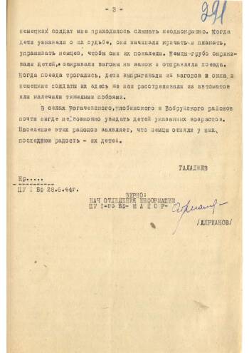 Донесение начальнику Главного политического управления Красной армии генерал-полковнику Щербакову А.С. начальника политуправления 1-го Белорусского фронта генерал-майора Галаджева С.Ф. от 28 июня 1944 года о зверствах немецких фашистов на оккупированной территории (создании донорских детских лагерей на территории Бобруйской и Могилевской областях). Машинописный текст. Подлинник. Донесение описывает ужасные зверства, творимые нацистами в оккупированных районах Белоруссии накануне подхода частей Красной Армии. Местные жители опрошенные освободившими их красноармейцами и командирами рассказывают истории, что в основном террор был направлен против детей, которых они «как собак» угоняли в спецлагеря, а также использовали насильно как доноров для переливания крови раненым нацистам. Отдельно отмечается, что в селах Рогачевского, Жлобинского и Бобруйского района нигде не увидеть детей.