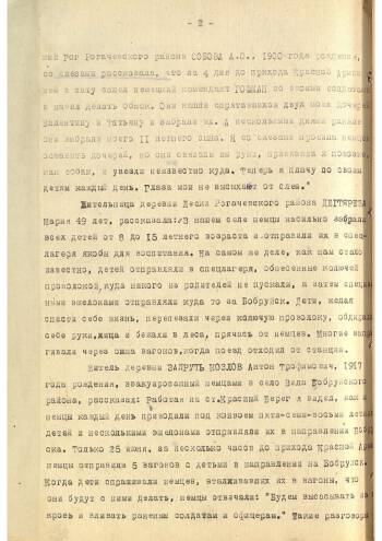 Report to the Chief of the Main Political Directorate of the Red Army, Colonel General A. Scherbakov Head of the Political Administration of the 1st Belorussian Front, Major General S. Galadzhev dated June 28, 1944 on the atrocities of the German fascists in the occupied territory (the creation of donor children's camps in the Bobruisk and Mogilev regions). Typewritten text. Script. The report describes the terrible atrocities committed by the Nazis in the occupied regions of Belarus on the eve of the approach of the Red Army. Local residents interviewed by the Red Army soldiers and commanders who freed them tell stories that terror was mainly directed against children whom they “drove like dogs” to special camps and also used forcefully as donors to transfuse wounded Nazis. It is separately noted that in the villages of Rogachev, Zhlobin and Bobruisk district, no children can be seen anywhere.
