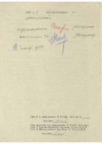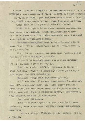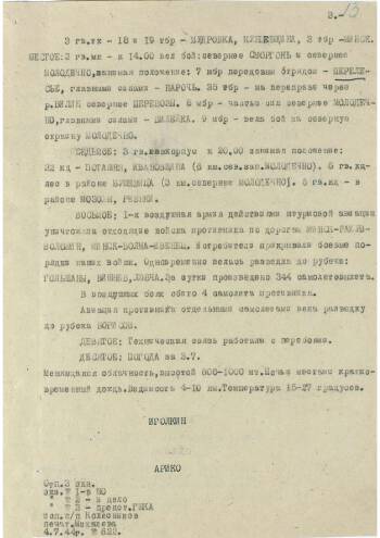 Operational report No. 71 / op dated July 4, 1944 (03.30) of the headquarters of the 3rd Belorussian Front on the capture of Minsk. A ten-point standard operational front-line report describing the state of affairs on the early morning of July 4. It indicates the mastery of the city of Minsk, the location of the units and formations of the front, as well as its air units. Mentioned enemy resistance and reconnaissance operations, as well as air battles. Of particular interest are the pace of advancement of parts of the front (25-35 km. Per day), information about losses and the capture of prisoners.