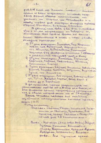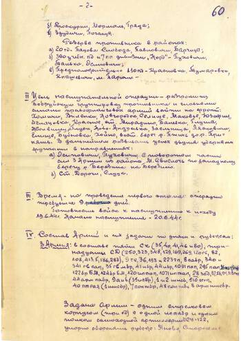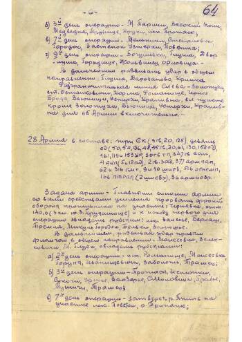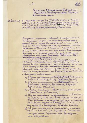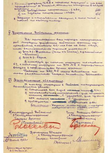 The plan of the Bobruisk offensive operation of the troops of the 3rd, 48th, 65th and 28th Armies of the 1st Belorussian Front, approved by G.K. Zhukov on June 7, 1944. The plan describes in detail the actions of the front, up to each army in its directions of strikes. The goals and objectives of the operation, the lines that need to be taken, the composition of the enemy’s forces are described. A very detailed description of the actions of the armies, including the days of the operation, is striking. Particular attention is paid to the material and technical equipment of the front.