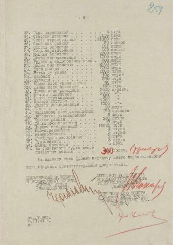 Resolution of the Military Council of the 3rd Belorussian Front No. 0169 dated November 10, 1944 "On measures to assist in the restoration of the national economy of Belarus." The front’s resolution contains a list of 55 items of material and technical equipment provided to the national economy of Belarus. Interestingly, these materials are captured and transported from the warehouse "Red tract", which belonged to the enemy. Cattle is supplied from frontal herds.
