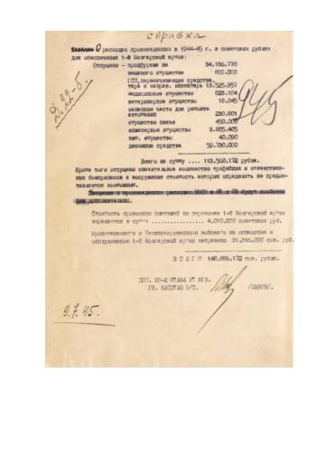 Справки о количестве и стоимости переданного продфуража за период с января по июнь 1945 года и о расходах, произведенных в 1944-1945 гг. в советских рублях для обеспечения 1-й Болгарской армии. ЦАМО. Ф. 243. Оп. 2963. Д. 136а. Л. 89, 94.