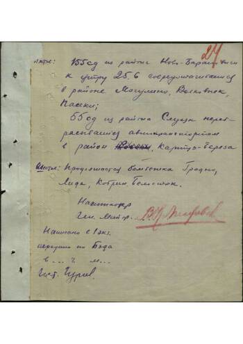 Боевое донесение Западного фронта № 005/оп Минск на 15-00 22.06.1941 г. Начальнику Генерального штаба Красной Армии. В этом донесении начальник штаба Западного фронта генерал-майор Климовских формулирует шесть основных пунктов своего доклада в Генштаб, по основным направлениям ведения боевых действий фронта. Указаны места сосредоточений и местонахождения частей фронта, отмечены части с которыми потеряна связь, анализируются главные направления бомбовых ударов противника.