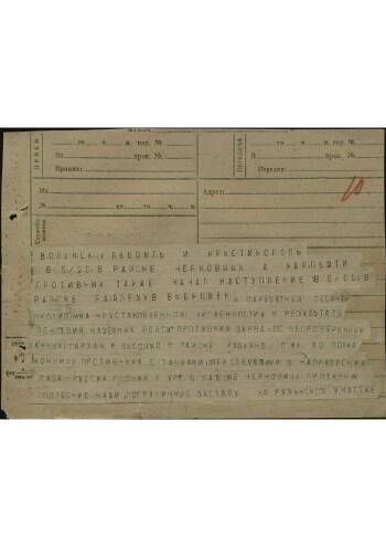 Оперативная сводка Генерального Штаба Красной Армии на 10-00 22.06.1941 г. Сводка описывает ситуацию на фронтах сложившуюся к 10-00 утра, подписана Начальником генерального штаба Красной Армии генералом армии Г.К. Жуковым. В сводке указываются направления основных ударов противника, перечисляются города, транспортные узлы, места сосредоточения наших войск, подвергнутые бомбардировкам. Отмечаются воздушные бои, в том числе в которых противник понес потери в самолётах. Особый интерес вызывают данные о взятии в плен солдата противника, в первые же часы войны.