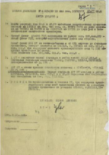 Combat report No. 6 of the headquarters of the 99th infantry division dated June 26, 1941. Describes the location of the units and formations of the division on its front. The positions of regiments and battalions of the division are indicated in detail. Also, the combat order mentions an attempt, in cooperation with parts of the nearest fortified area and the entire artillery of the division, to prevent the breakthrough of large enemy forces in the direction of its main attack on Przemysl.