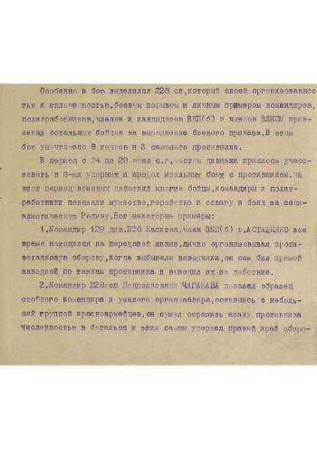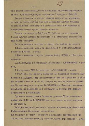 Политдонесение за подписью полкового комиссара 55-й стрелковой дивизии Васильева. Донесение описывает бои, ведшиеся дивизией с 22.06.1941. Обращает на себя внимание детальное описание подвигов большого числа красноармейцев и командиров, несмотря на в целом тяжелую обстановку на фронте. Интересен и факт большого роста количества заявлений о вступлении в партию, которые подавали наши бойцы. Отдельно упомянута нехватка людских ресурсов для призыва в армию на основании проверок военкоматов и тяжелое положение с амуницией, горючим и боеприпасами. Однако несмотря на эти трудности дивизия продолжает вести бои.