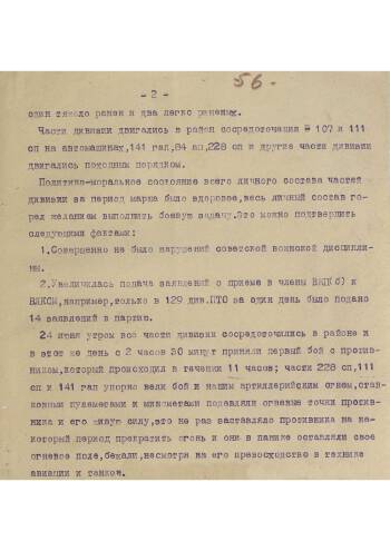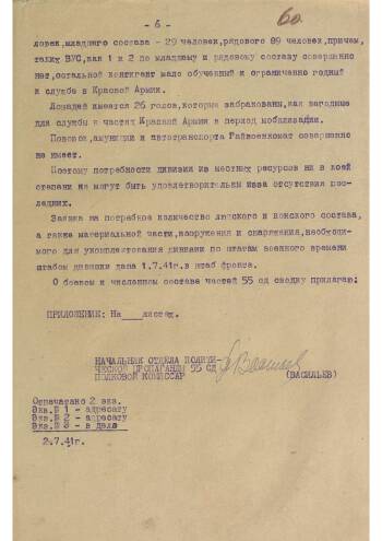 Political report signed by the regimental commissar of the 55th Infantry Division Vasiliev. The report describes the battles waged by the division from 06.22.1941. Noteworthy is a detailed description of the exploits of a large number of Red Army men and commanders, despite the generally difficult situation at the front. An interesting fact is the large increase in the number of applications for joining the party that our fighters submitted. Separately mentioned is the lack of human resources for recruiting to the army on the basis of inspections of military enlistment offices and the difficult situation with ammunition, fuel and ammunition. However, despite these difficulties, the division continues to fight.