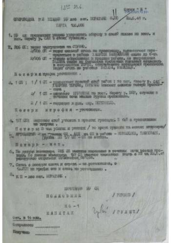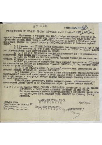 Intelligence reports of the headquarters of the 99th Infantry Division dated June 23, 1941. Signed by the chief of staff of the division, Colonel Gorokhov and the chief of intelligence of the division, Captain Lidkovsky. The reports describe the confrontation between the units of the division and the advancing German forces, their location and possible directions of strikes. Noteworthy is the fierce nature of the fighting and the staunch resistance of the Red Army, some settlements, during the day several times passed from hand to hand. Separately, the document indicates the priority of determining the number of motorized units of the enemy.