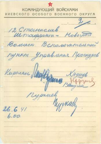 Донесение командующего войсками Юго-Западного фронта И.В.Сталину о намеченном плане отхода войск фронта на рубеж р. Стоход, р. Стырь, Кременец, Золочев, Миколаюв, Стрый, Долина, Вышкув на 06 часов 00 минут 26 июня 1941 года.