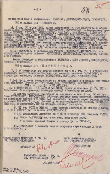 The battle order of the 3rd Guards tank army headquarters describes the action plan for the army units for May 7-8, 1945. The relative small number of enemy troops and the lack of prepared engineering structures for defense are noted. The order was signed by the commander of the 3rd Guards tank army, Colonel-General Rybalko, chief of staff, major-General Bakhmetyev, and a member of the Military Council, Lieutenant-General Melnikov.