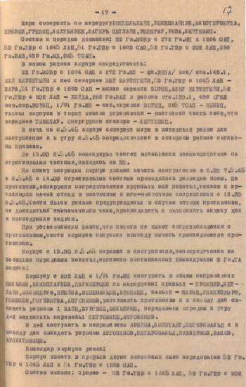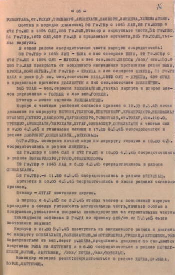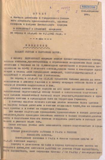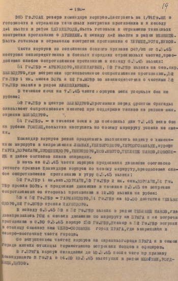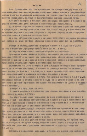 Документ представляет собой отчет, в котором описываются действия 6-го Гвардейского танкового корпуса по освобождению города Праги. Особый интерес представляет вывод из наблюдений за поведением противника, сопротивление которого не усиливалось как прежде, а наоборот ослабевало в ходе операции. Документ подписан штабом 6-го Гвардейского танкового корпуса: командиром генерал-майором В.А. Митрофановым и начальником штаба гвардии полковником С.В. Лебедевым.
