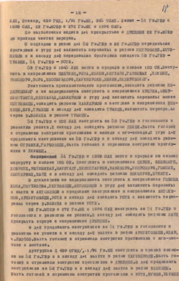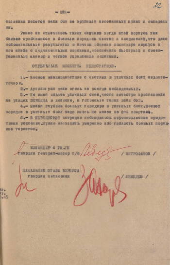 The document is the report describing the actions of the 6th Guards tank corps to liberate the city of Prague. Of particular interest is the conclusion from observations of the behavior of the enemy whose resistance did not increase as before, but on the contrary weakened during the operation. The document was signed by the staff of the 6th Guards tank corps: commander Major General V.A. Mitrofanov and chief of staff of the Guard Colonel S. V. Lebedev.