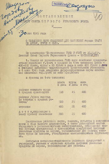 Постановление Военного Совета 1-го Украинского фронта от 30 мая 1945 года о повышении нормального снабжения для населения города Праги