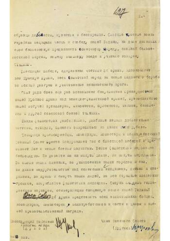 Приказ командующего войсками Резервного фронта Г. Жукова от 07 сентября 1941 г. № 044 о победе, одержанной частями 24-й армии в районе г. Ельня.