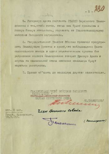 Приказ войскам Западного направления от 10 июля 1941 г. № 0058 г. Смоленск с объявлением Постановления Государственного Комитета обороны о назначении Главнокомандующим войсками Западного направления маршала Советского Союза Наркома обороны С. Тимошенко с подчинением ему войск Западного фронта.