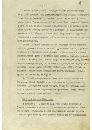 ИЗ ЖУРНАЛА БОЕВЫХ ДЕЙСТВИЙ ВОЙСК 1-ГО ДАЛЬНЕВОСТОЧНОГО ФРОНТА ЗА АВГУСТ 1945 Г. ОБСТАНОВКА НА ДАЛЬНЕВОСТОЧНОМ ТЕАТРЕ ВОЕННЫХ ДЕЙСТВИЙ.