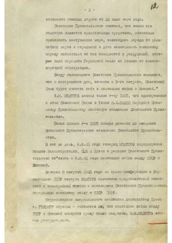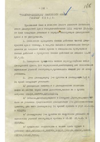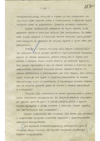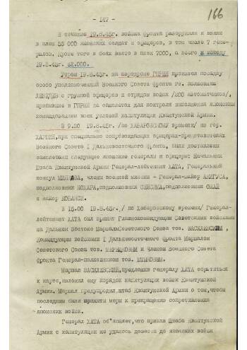 ИЗ ЖУРНАЛА БОЕВЫХ ДЕЙСТВИЙ ВОЙСК 1-ГО ДАЛЬНЕВОСТОЧНОГО ФРОНТА ЗА АВГУСТ 1945 Г. ОБСТАНОВКА НА ДАЛЬНЕВОСТОЧНОМ ТЕАТРЕ ВОЕННЫХ ДЕЙСТВИЙ. ОПИСАНИЕ ПЕРЕГОВОРОВ ГЛАВНОКОМАНДУЮЩЕГО СОВЕТСКИМИ ВОЙСКАМИ НА ДАЛЬНЕМ ВОСТОКЕ МАРШАЛА СОВЕТСКОГО СОЮЗА А.М. ВАСИЛЕВСКОГО С НАЧАЛЬНИКОМ ШТАБА КВАНТУНСКОЙ АРМИИ ГЕНЕРАЛ-ЛЕЙТЕНАНТОМ ХАТА 19 августа 1945 г.
