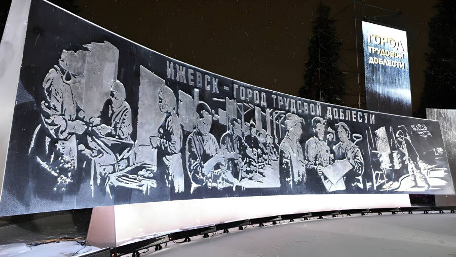Стела “Ижевск – город трудовой доблести” была торжественно открыта 9 декабря 2022 года. Создание монумента стало возможным благодаря указу Президента РФ от 2 июля 2020 года и поддержке Российского Военно-исторического общества. 17-метровой стела была размещена в Сквере Победы и посвящена жителям Ижевска, которые активно трудились в тылу на благо фронта.