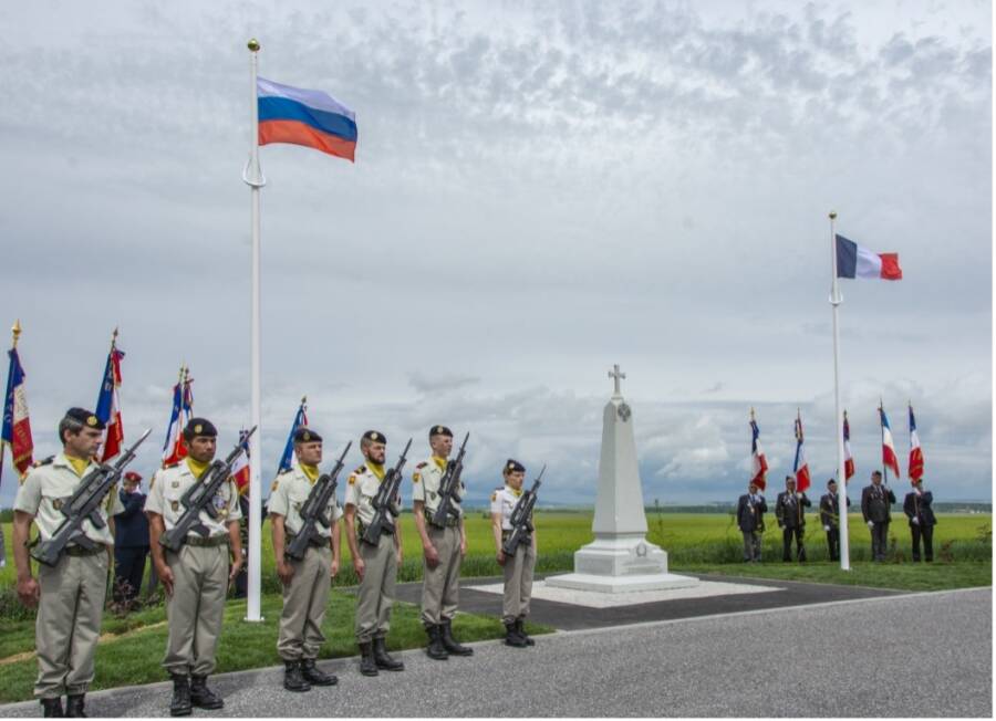 - Мы находимся на поле боя. Именно здесь сражались наши солдаты из Экспедиционного корпуса в очень сложной битве, 2 тысячи из них полегли на этом месте. Для нас было делом чести поставить этот монумент, — сказал посол Российской Федерации во Франции Алексей Мешков, присутствовавший на открытии обелиска.