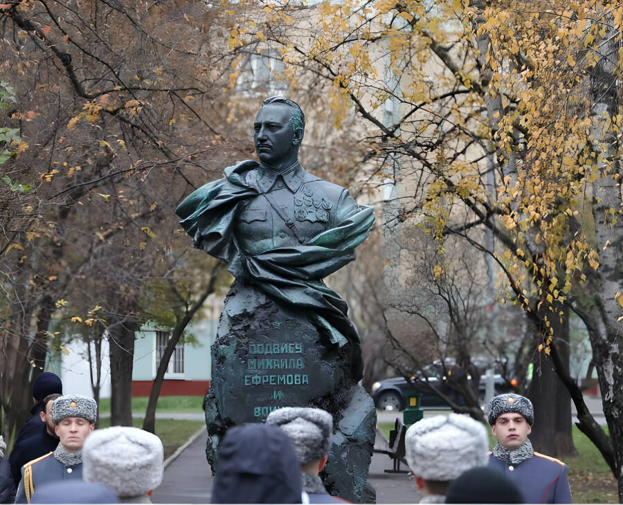 Памятник генерал-лейтенанту Михаилу Григорьевичу Ефремову был торжественно открыт 7 ноября 2022 года на пересечении улиц Ефремова и 3-й Фрунзенской в Москве.