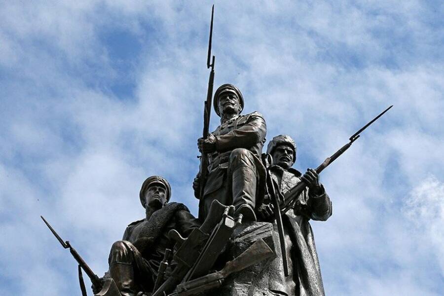 Сама композиция включает в себя три бронзовые скульптуры на постаменте, которые выполнены в виде офицера, прапорщика и солдата времён Первой мировой войны. Высота памятника – 11 метров. В верхней части монумента расположены слова: “Благодарная Россия героям Первой мировой войны”.