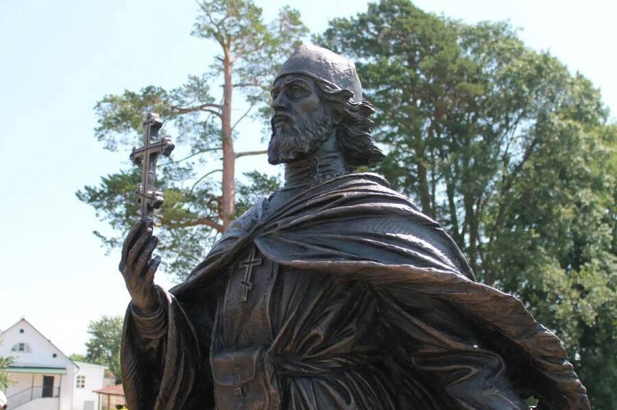 Памятник появился по инициативе Российского военно-исторического общества. На конкурс пришло много работ, но утверждён был проект скульптора Виталия Шанова. Воздвигли монумент в честь возрождения монастыря и перенесения туда мощей священнослужителя.