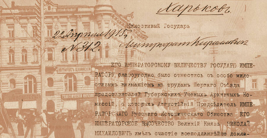 В фондах Российского государственного исторического архива (РГИА) хранится «Дело об учреждении Харьковской губернской учёной архивной комиссии» (РГИА. Ф. 746. Оп. 1. Д. 168), которое включает в себя исторический источник о деятельности Императорского Русского исторического общества (ИРИО) в 1915 г.