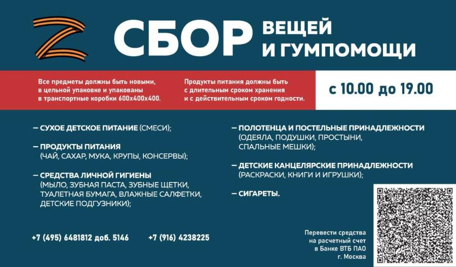 Всем желающим помочь мирным жителям и поддержать наших военных напоминаем, что сбор помощи осуществляется на территории Музея военной формы по адресу: ул. Большая Никитская, дом 46/17 стр.1.