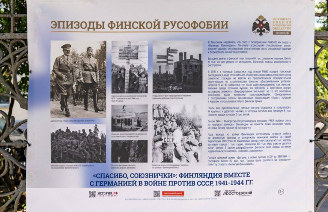 30 мая в Москве напротив посольства Финляндской Республики и рядом с метро «Парк Культуры» была открыта выставка Российского военно-исторического общества «Эпизоды финской русофобии».