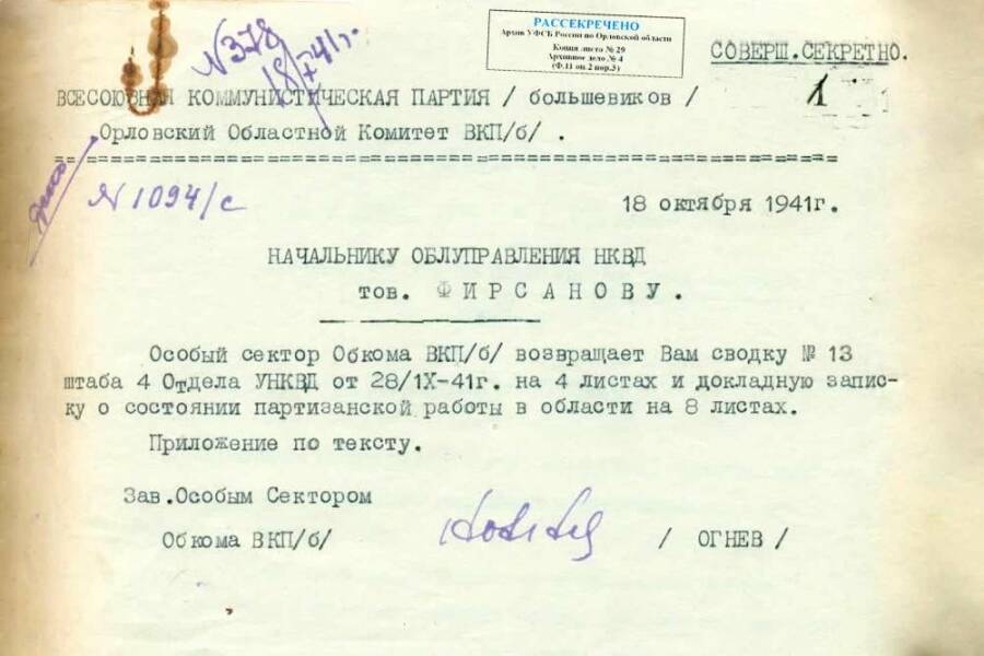 ФСБ рассекретила архивные документы о деятельности сотрудников НКВД в тылу врага осенью 1941 года. Материалы раскрывают диверсионную деятельность сотрудников орловской НКВД против нацистов в самом начале войны.