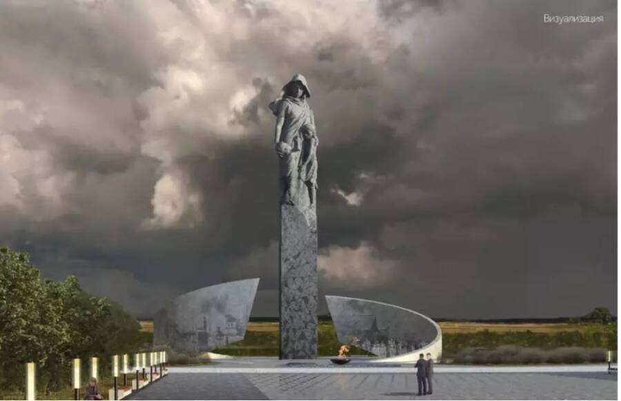 Домината Мемориала – устремленная в небо стела, на вершине которой расположена фигура матери с детьми. Эту семью враги выгнали из дома, даже не дав одеться – женщина и дети, беззащитные перед стихией, не способные противостоять насилию, поставленные перед лицом неминуемой смерти. Поверхность стелы исчерчена нитями колючей проволоки, что подчеркивает уязвимость людей перед бездушной сталью, несущей смерть и страдания. Центральная стела опоясана двумя пилонами, символизирующими вихри войны, которые закружили людей. В оформлении пилонов отражены образы стариков, женщин и детей, обреченных нацистами на смерть. Над ними – души невинно убиенных, которые устремляются в бессмертие. У подножия Мемориала будет зажжен Вечный Огонь.