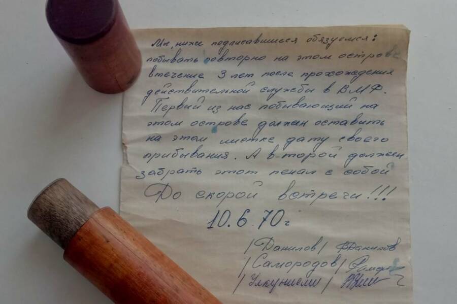 Пожелтевший листок бумаги был уложен в деревянный пенал, в котором раньше хранили письменные принадлежности. В письме три товарища обещают вернуться на островах в течение трех лет после демобилизации и забрать с собой пенал. За письмом друзья не вернулись, зато теперь, спустя 50 лет, его нашли реставраторы.