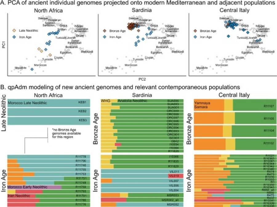 Что касается Сардинии, то, по словам ученых, в бронзовый век на острове проживало генетически однородное население. Это изменилось в железном веке с началом экспансии Карфагена. Жители поселения Вилламар (818–392 годов до н.э.) были в большинстве связаны с населением Марокко позднего неолита. Их современники из поселения Монте-Сираи (около 800–300 годов до н.э.) генетически схожи с популяциями Центральной Италии и Сицилии.