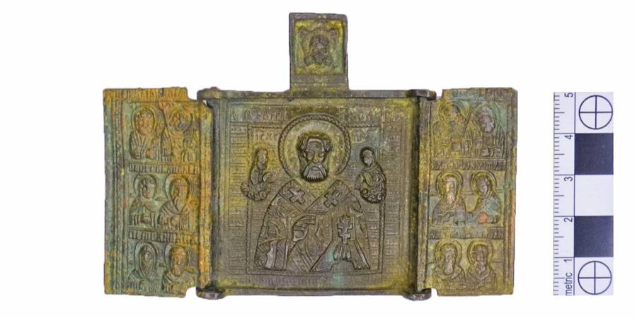 Интерес также представляет хорошо сохранившаяся икона-складень XVIII века из медного сплава. Икона — 10 на 7 сантиметров изображает Николая Угодника — покровителя путешественников. Археологи пояснили, что такие иконы раньше часто брали с собой на богомолье или носили как личные образки. Все находки пройдут реставрацию, после чего будут переданы в музеи города.