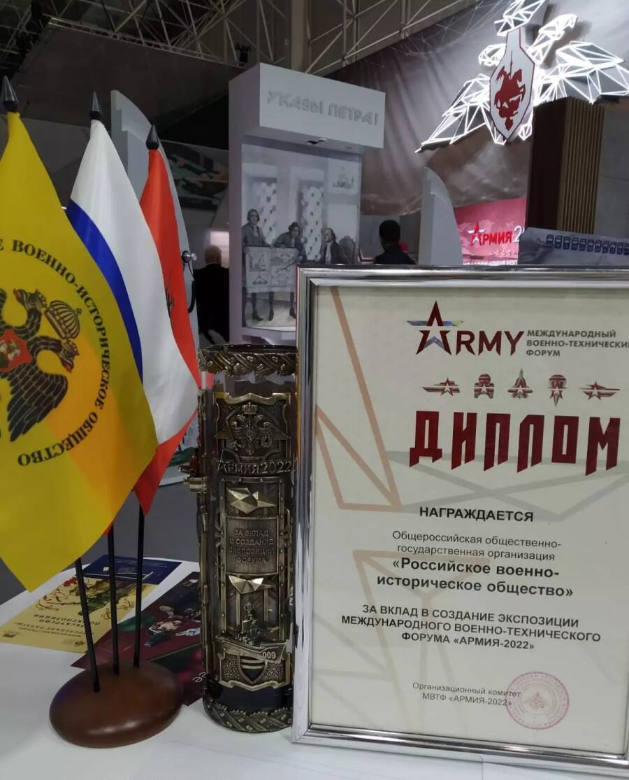 Российское военно-историческое общество удостоено диплома и награды «За вклад в создание экспозиции Международного военно-технического форума «Армия-2022»».