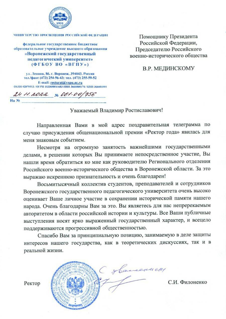 «Восьмитысячный коллектив студентов, преподавателей и сотрудников Воронежского государственного педагогического университета очень высоко оценивает Ваше личное участие в сохранении исторической памяти нашего народа. Очень благодарны Вам за это. Вы являетесь для нас непререкаемым авторитетом в области российской истории и культуры. Все Ваши публичные выступления носят ярко выраженный государственный характер, и всецело поддерживаются прогрессивной общественностью. Спасибо Вам за принципиальную позицию, занимаемую в деле защиты интересов нашего государства», - написал Сергей Филоненко.