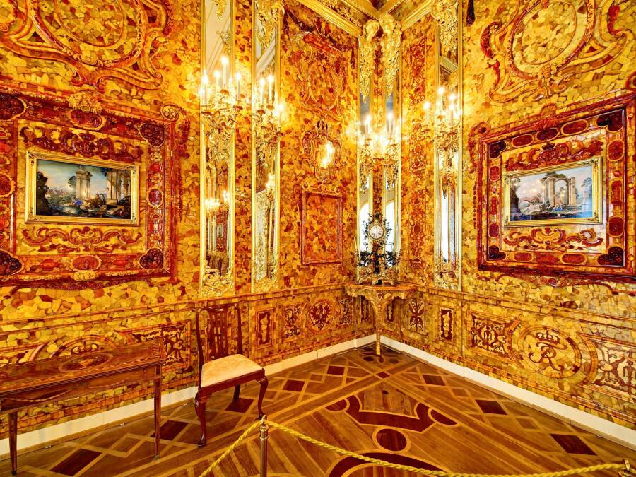 Янтарная комната была подарена Петру I прусским королем Фридрихом Вильгельмом I. В царствование Екатерины II ее разместили в Екатерининском дворце в Царском Селе. В 2003 году, к 300-летию Санкт-Петербурга, в царскосельском дворце презентовали копию Янтарной комнаты: работа над ней велась на протяжении 25 лет, в отделке было использовано 6 тонн янтаря.