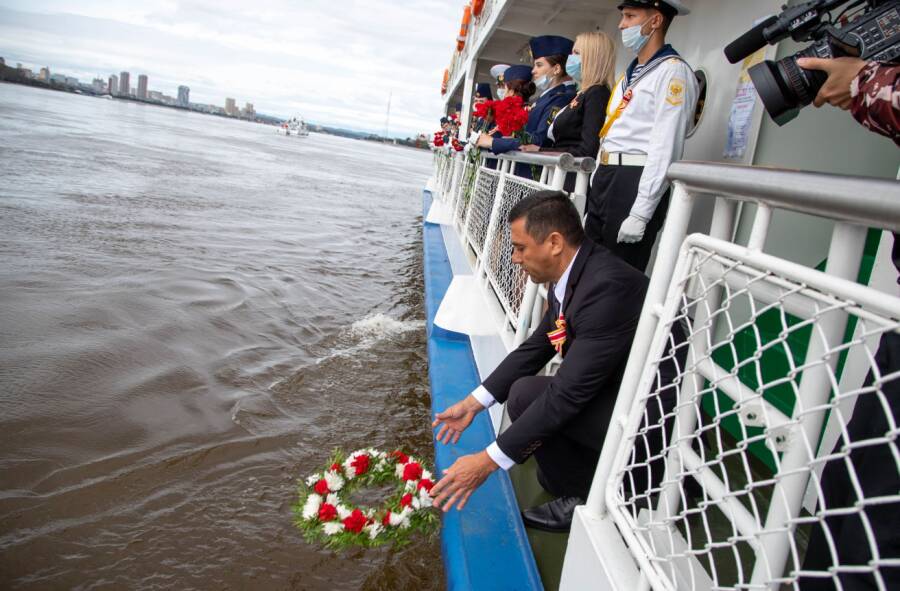 «Два судна - российское и китайское - встретились на середине пограничного Амура. Участие в акции приняли мэр Благовещенска Олег Имамеев и Первый секретарь горкома КПК, председатель собрания народных представителей Ли Сивэнь. Они опустили венки на воду в память о павших воинах двух государств», - рассказали об акции в Минвостокразвития.