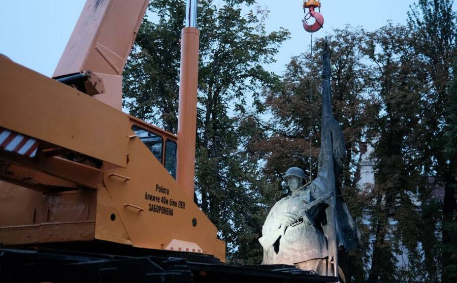 "Всего через час сняли памятник красноармейцу с постамента на Соборной площади. Ни в коем случае уничтожать его не будем. Переместим туда, где ему место", - сообщили в Черновецком городском совете.