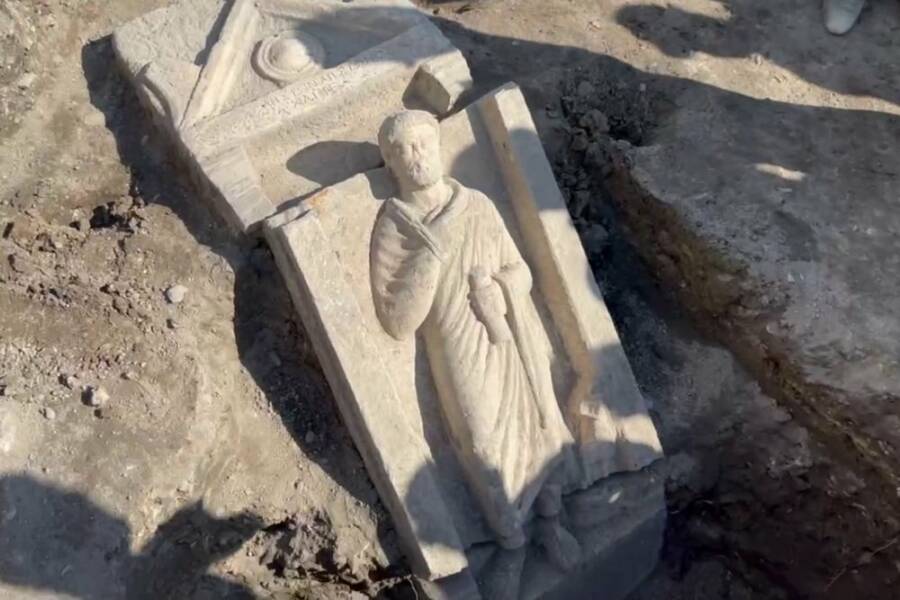 Начальник археологической экспедиции Института истории материальной культуры РАН Сергей Соловьев отметил, что надгробие выполнено из мрамора. Также присутствует небольшая фигурка плакальщицы, которая оплакивает усопшего. Это указывает на высокий статус захороненного человека.