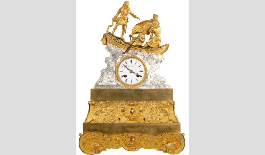 Это каминные часы, созданные по мотивам картины русско-французского художника Карла Штейбена "Петр Великий во время бури на Ладожском озере спасает утопающих". После показа этой картины на Парижском Академическом салоне в 1812 году, ее приобрел Наполеон I. Сейчас картина находится в музее французского города Амьен, а воспроизведенную в шпалере картину французский король Людовик ХVIII подарил императору Александру I - она сейчас хранится в Петергофе.