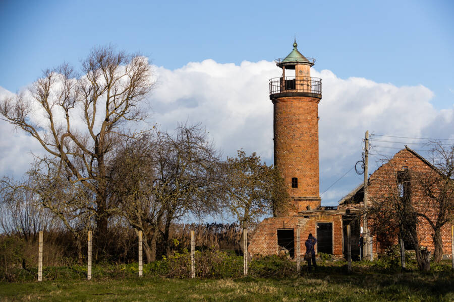 Маяк на Куршском заливе относится к тем немногим довоенным постройкам, сохранившимся до наших дней. Известно, что его основание было построено еще в 1868 году: тогда маяк представлял собой 12-метровую балку с керосиновой лампой. В начале XX века на месте незамысловатой постройки появилась 15-метровая башня с винтовой лестницей.
