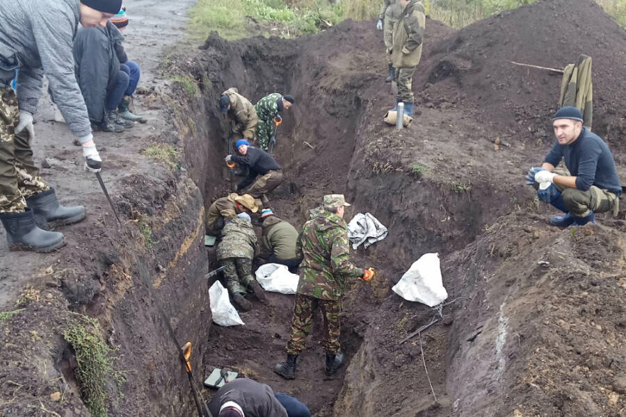 В поселке Горшечное Курской области при строительстве водопровода обнаружили массовое захоронение советских солдат времен Великой Отечественной войны. В ходе раскопок были обнаружены останки 132 человек.