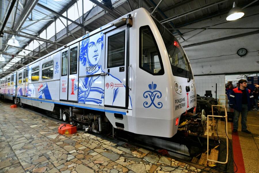 В столичном метрополитене запустили тематический поезд, посвященный 350-летию со дня рождения Петра I. Состав оформлен в серо-синих тонах. Вагоны внутри и снаружи украшены портретами императора, также на стенах размещены интересные факты о его жизни.